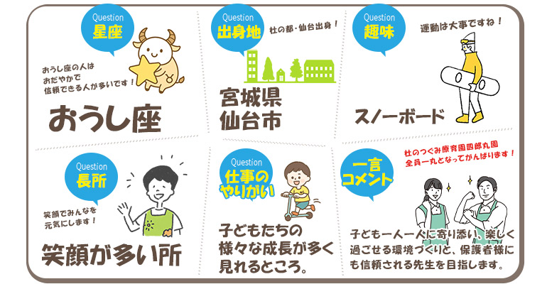 子どもたちが楽しく過ごせるように一緒にたくさん遊びつつ、子ども達一人一人に寄り添った支援をしていきたいと思います。また、子ども達だけではなく保護者様からも信頼できるような先生になれるよう頑張りたいと思います。どうぞよろしくお願いします。